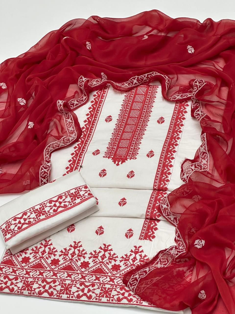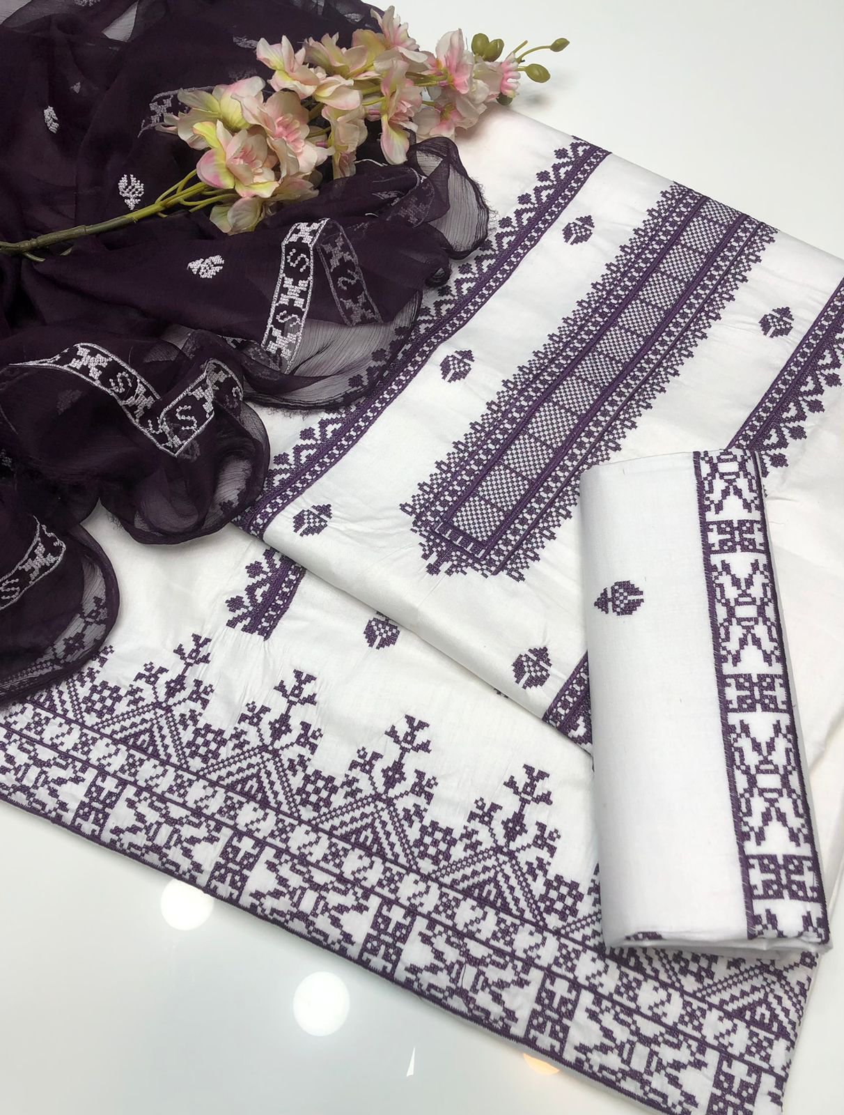 The shirt is adorned with fine cross-stitch embroidery, adding a rich and graceful look suitable for both casual wear and festive gatherings. Paired with a crinkle chiffon dupatta enhanced with detailed cross-stitch karhai, this suit delivers a luxurious finish that stands out effortlessly.
